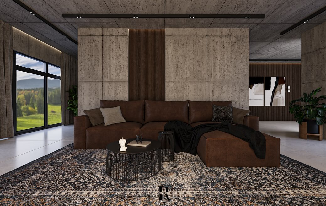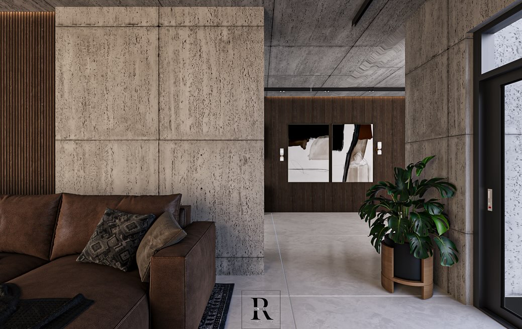 Beton yüzeylerin sağlam ve yalın ifadesi, ahşap detayların sıcaklığıyla dengeleniyor. Sanat eserleri ve doğal bitkilerle zenginleştirilen bu alan, modern tasarımın işlevselliğini estetik bir zarafetle buluşturuyor.